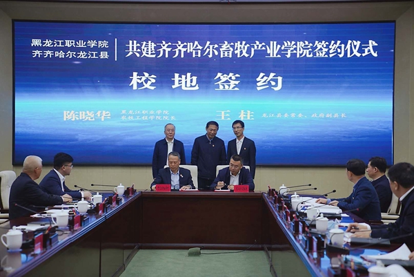 黑龍江經(jīng)濟網(wǎng)訊(李福山 王鴻儒 記者魏伯勤)為搭建校地校企合作平臺,聚焦產(chǎn)業(yè)人才短板,接軌應(yīng)用型院校人才培養(yǎng)體系,建立產(chǎn)業(yè)人才聯(lián)合培養(yǎng)機制,4月28日,黑龍江職業(yè)學(xué)院與龍江縣人民政府“共建齊齊哈爾畜牧產(chǎn)業(yè)學(xué)院”簽約儀式在齊齊哈爾市仙鶴賓館舉行。這次簽約是齊齊哈爾市“校企政”合作的一次有益探索,是產(chǎn)業(yè)人才培養(yǎng)、產(chǎn)教融合的新路徑、新載體,是推動齊齊哈爾全市畜牧業(yè)高質(zhì)量發(fā)展的一項重要舉措。
