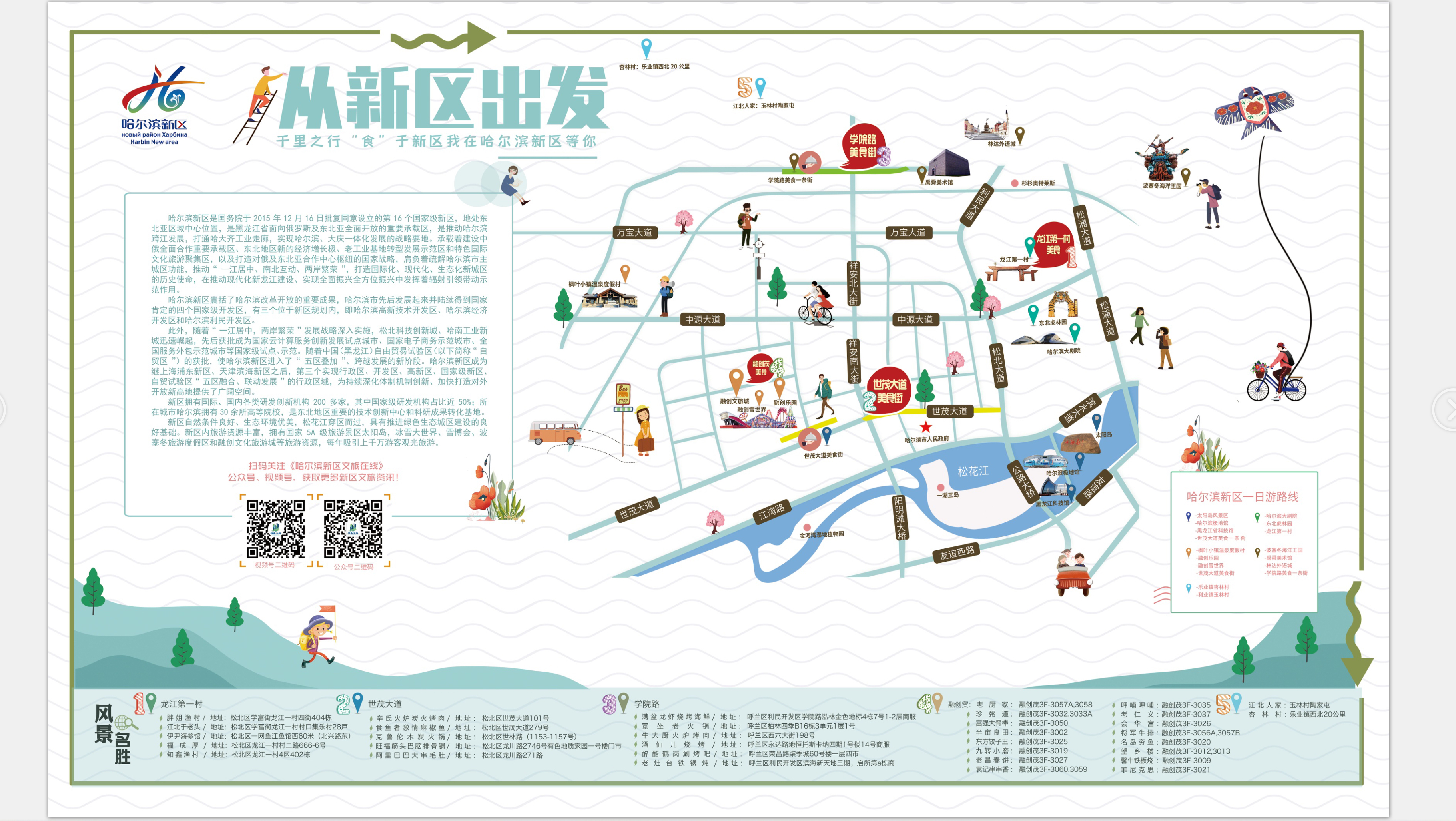 《哈爾濱新區(qū)美食地圖》以新區(qū)特色美食為主題,突出“美食+旅游”的特色結(jié)合,旨在為游客推薦新區(qū)多種多樣的優(yōu)質(zhì)美景美食,在豐富游客度假體驗的同時,叫響本土美食品牌,并推出五條“美食+”旅游度假一日游路線。通過《哈爾濱新區(qū)美食地圖》,市民和游客可以一站式了解新區(qū)的“吃住游娛購”。
