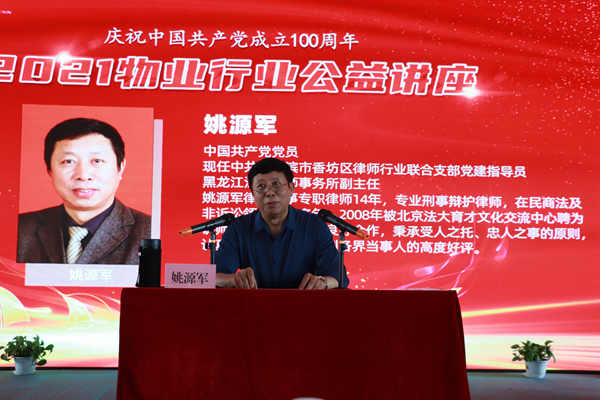 黑龍江省江山律師事務所律師副主任姚源軍做了《民法典所涉及物業(yè)行業(yè)的相關條款解讀》講座。姚源軍重點講解了《民法典》與物業(yè)管理、物權、合同、侵權責任及其他法律風險等內(nèi)容知識;通過大量典型案例,圍繞物業(yè)管理涉及的法律問題, 以及行業(yè)經(jīng)營中的風險點、法律條款、解決思路、案例實務,全面介紹了《民法典》視角下的物業(yè)管理責任邊界等內(nèi)容,幫助與會人員系統(tǒng)的了解了物業(yè)管理相關法律法規(guī)體系。