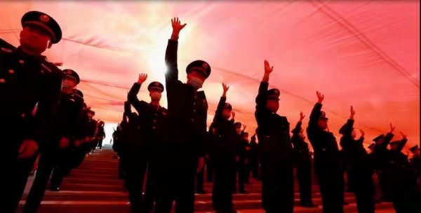 伴隨著激昂的樂曲,一面400平方米的巨幅黨旗緩緩展開,面向鮮紅的黨旗,在場的黨員干部和居民群眾心潮澎湃。100名黨員整齊列隊(duì),在領(lǐng)誓人的帶領(lǐng)下舉起右拳,莊嚴(yán)宣誓,重溫入黨誓詞,回望入黨初心,抒發(fā)對黨忠誠的意志和信念。