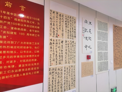 據(jù)了解,此次活動共入展攝影作品41幅、書法作品15幅、繪畫作品13幅、手工制作5件、詩歌2首及微視頻4部,其中部分作品在該院門診五樓進行了展示。攝影作品《守護》,作者是省醫(yī)院兒科副主任汪琪,通過鏡頭展現(xiàn)了醫(yī)務工作者的日常忙碌,及不知疲倦、一絲不茍的內(nèi)心世界;書法作品《紅船精神》,作者是省醫(yī)院南崗院區(qū)泌尿外一科主任楚寧,筆法嫻熟、清秀雋永,字里行間體現(xiàn)出堅定理想、百折不撓的奮斗精神;書法作品《不忘初心》聯(lián)句,作者是省醫(yī)院南崗院區(qū)普外科姜峰奇,古樸自然,一顆紅心永向黨;繪畫作品《一唱雄雞天下白》,作者是省醫(yī)院退休老干部張克起,作品直接用畫面抒發(fā)革命浪漫主義情懷;繪畫作品《江山多嬌》,作者是省醫(yī)院退休老職工賈雨虹,用嬌美的花朵為黨的百年華誕獻禮。