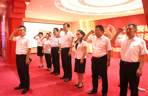 在地區(qū)黨史學習教育展館,面對鮮紅的黨旗,新林區(qū)委書記領誓,區(qū)委理論學習中心組成員集體宣誓,重溫入黨誓詞,砥礪前進初心,勇?lián)氊熓姑?/span>