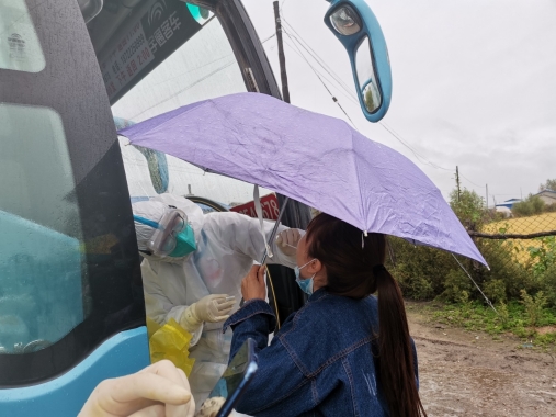 省醫(yī)院南崗院區(qū)中心手術(shù)室護(hù)士趙明裕,中秋節(jié)當(dāng)天下午正在家中給八歲的大女兒過(guò)生日,接到通知需要支援巴彥縣核酸采集,親了親身邊的大女兒和四歲的小女兒,立即驅(qū)車(chē)前往醫(yī)院。到達(dá)巴彥后,趙明裕被分到后山鄉(xiāng),三人小組同組另兩位隊(duì)員都是年過(guò)40歲的大姐,已經(jīng)是預(yù)備黨員的趙明裕想想自己年輕一定要多干些,主動(dòng)請(qǐng)纓承擔(dān)了更多的工作。當(dāng)天,三人共完成了五個(gè)村屯近600人的采集,外面陰雨綿綿,氣溫驟降,手消涂在手套上,全手掌冰涼的感覺(jué)讓趙明裕本就著裝不多的身體愈發(fā)冰冷,但想到臨行前醫(yī)院同事一次次的叮嚀與囑托,她心中堅(jiān)信,抗疫必勝。同時(shí)當(dāng)?shù)卮迕竦臒崆橐沧屭w明裕的心里暖暖的,后山鄉(xiāng)政府的工作人員和人民群眾都非常積極的配合,尤其是老人和小孩,并沒(méi)有由于天氣陰雨綿綿的原因而不配合,都在鄉(xiāng)領(lǐng)導(dǎo)的指揮下,井然有序的配合著。