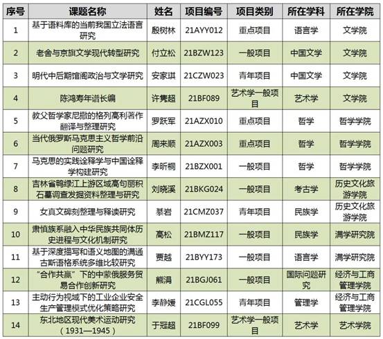 黑龍江經(jīng)濟(jì)網(wǎng)訊(黑龍江日?qǐng)?bào)全媒體見(jiàn)習(xí)記者董廣碩 商祺)日前,全國(guó)哲學(xué)社會(huì)科學(xué)工作辦公室公布了2021年國(guó)家社科基金年度項(xiàng)目和青年項(xiàng)目立項(xiàng)名單。本年度國(guó)家社科基金共立項(xiàng)目4642項(xiàng),其中重點(diǎn)項(xiàng)目370項(xiàng),每項(xiàng)資助35萬(wàn)元;一般項(xiàng)目3169項(xiàng),青年項(xiàng)目1103項(xiàng),資助額度均為20萬(wàn)元。連同之前公布的藝術(shù)學(xué)科項(xiàng)目,黑龍江大學(xué)共獲得2021年國(guó)家社科基金年度項(xiàng)目和青年項(xiàng)目14項(xiàng)。其中重點(diǎn)項(xiàng)目3項(xiàng)、一般項(xiàng)目6項(xiàng)、青年項(xiàng)目3項(xiàng)、藝術(shù)學(xué)一般項(xiàng)目2項(xiàng),立項(xiàng)總數(shù)居全省第1位。