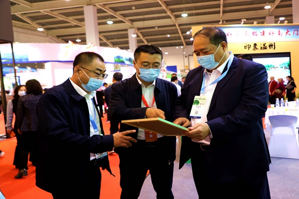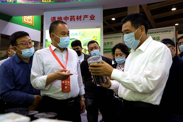 阿木爾林業(yè)局黨委書記胡守慶(右一)查看參展產(chǎn)品質(zhì)量情況(王力/攝)