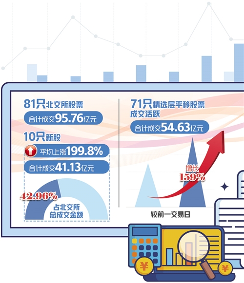 北交所首個交易日運行平穩(wěn),81只股票合計成交95.76億元。首批上市交易的10只新股全線上揚,盤中均觸發(fā)兩次臨時停牌。截至收盤,10只新股平均較發(fā)行價上漲199.80%。71只從精選層平移至北交所的股票漲跌互現(xiàn)。