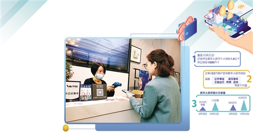 線下場景日益多元的同時,數(shù)字人民幣交易場景也正在發(fā)力線上,形成了“線上+線下”并行推廣的格局。現(xiàn)在,數(shù)字人民幣已經(jīng)可以在京東、美團、滴滴等多個線上場景使用。截至10月22日,已有155萬商戶支持數(shù)字人民幣錢包,涵蓋公共事業(yè)、餐飲服務(wù)、交通出行、購物和政務(wù)等各個方面。