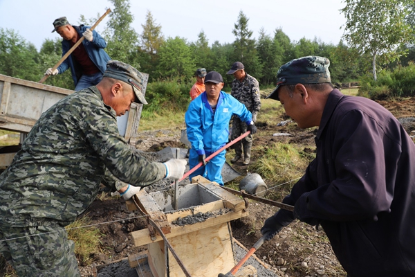 阿木爾林業(yè)局職工為興安林場精品民宿打T型混凝土方墩底座(王力 攝)