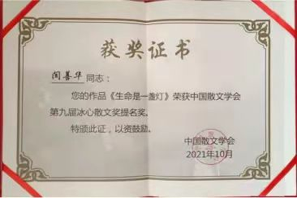 在幾十年的文學創(chuàng)作和編輯工作中,她不斷堅持學習提高,筆耕不輟,執(zhí)著堅守。在2020年10月發(fā)表在《北極光》上的散文《生命是一盞燈》,因主題對生命的感悟,用縱橫寬泛的思路、真摯的情感,流暢的文筆,經評委嚴格評審,最終脫穎而出,獲得本屆冰心散文獎單篇提名獎。這對于一直深居邊陲縣城的一名作家,能邁進冰心散文獎這中國散文最高獎的大門,是一個非常難得的殊榮。