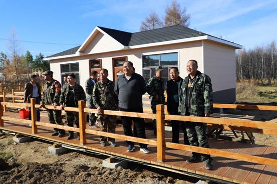 阿木爾林業(yè)局黨委副書記、局長韓鳳泉(前一)檢查指導(dǎo)龍河林場民宿建設(shè)情況(王力 攝)