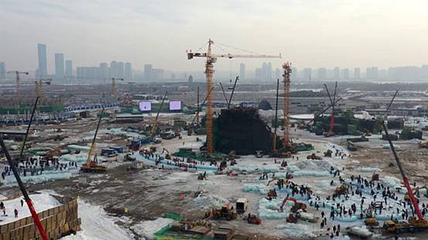 記者在哈爾濱冰雪大世界園區(qū)建設(shè)現(xiàn)場(chǎng)看到,工人們有序地忙碌著,塔吊、叉車(chē)、鏟車(chē)等各種機(jī)械設(shè)備在緊張作業(yè),工人切冰、鏟冰的聲音與作業(yè)機(jī)械的轟鳴聲,在園區(qū)內(nèi)交織成一首“建設(shè)交響樂(lè)”。
