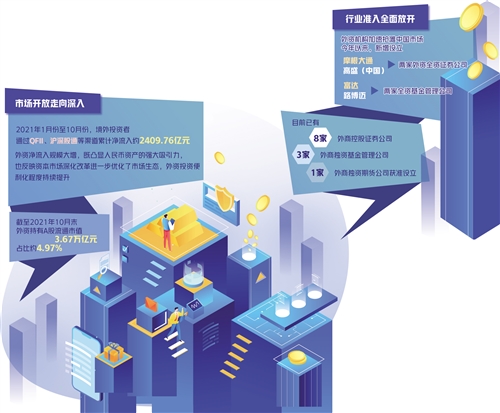 一系列開放舉措吸引了外資的高度關(guān)注和認(rèn)可,外資參與中國市場熱情高漲,在華投資展業(yè)活動加快推進(jìn)。截至2021年10月末,外資持有A股流通市值3.67萬億元,占比約4.97%。