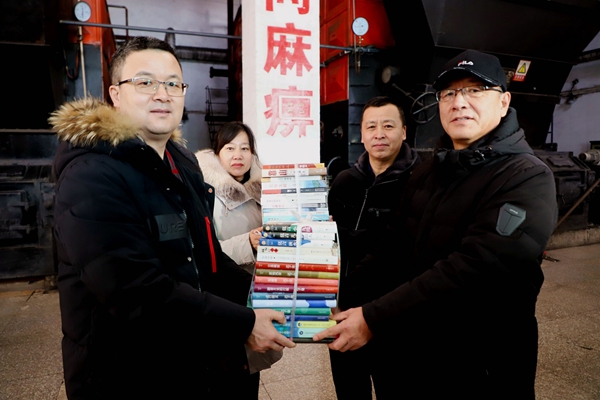 阿木爾林業(yè)局黨委委員、宣傳部部長(zhǎng)高樹(shù)源(左一)為物業(yè)公司送書籍的精彩瞬間(王力 攝)