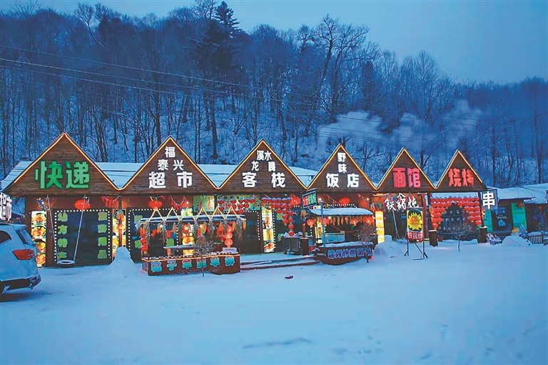 當(dāng)我們抵達(dá)雪谷的時候,暮色已濃,天地間覆蓋了一片黑色的幕布。但雪谷中心街道上,聳立著由上千只大紅燈籠排列組合的拱形門,燈火輝煌,延續(xù)百米開外。門的頂端中央鑲嵌著“中國雪谷”四個金色大字,格外醒目。我們停下車拍照,并就近住宿,溫暖的火炕讓我們很快進(jìn)入夢鄉(xiāng)。