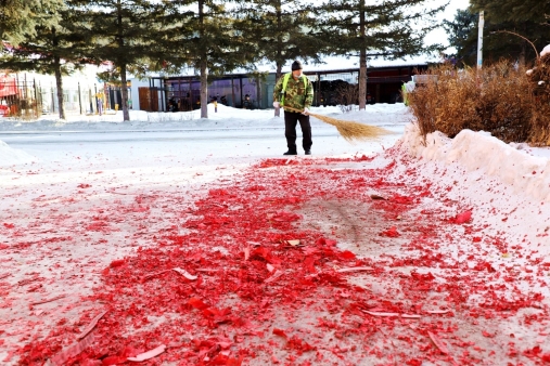 黑龍江經(jīng)濟(jì)網(wǎng)訊(王力 記者馬朝林)天剛蒙蒙亮,呈現(xiàn)眼前的是大年三十夜晚燃放的鞭炮紙屑,遍地開花,仿佛是紅地毯一樣。多名環(huán)衛(wèi)工冒著零下30多度的嚴(yán)寒,不顧帽子、眉毛結(jié)滿冰霜,有的用掃帚清掃,有的撿拾紙屑煙頭,有的推移垃圾箱……