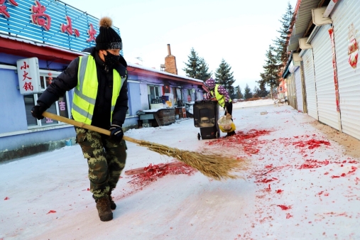 阿木爾林業(yè)局環(huán)衛(wèi)隊(duì)環(huán)衛(wèi)工人在大年初一早上清掃責(zé)任區(qū)鞭炮紙屑(王力 攝)