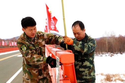紅旗林場職工在京漠公路2410公里處的阿木爾河大橋安裝防火宣傳彩旗(王力 攝)