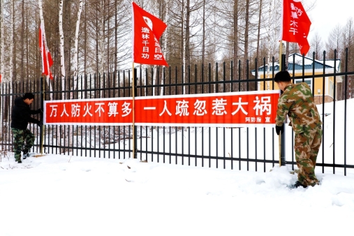 紅旗林場職工在第一管護(hù)站掛宣傳防火宣傳條幅(王力 攝)