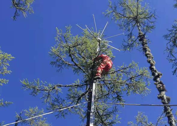 呼中林業(yè)局工作人員依附樹(shù)木進(jìn)行“拒雷”設(shè)備安裝(徐志偉攝)