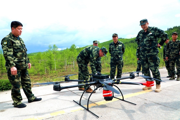 阿木爾林業(yè)局黨委副書記、局長、局防指總指揮韓鳳泉(左二)在查看無人機狀況(王力 攝)