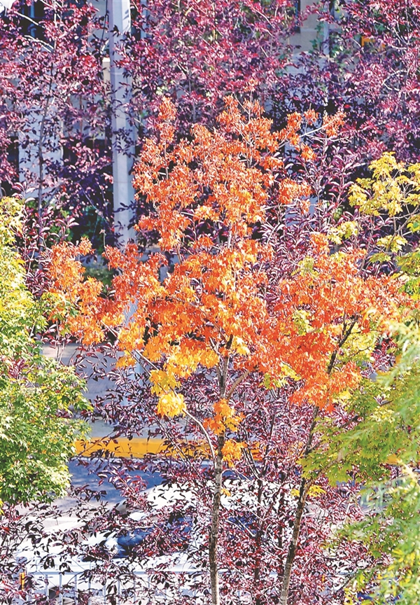 13日,哈爾濱市道里區(qū)景江東路附近的綠化帶里,一些樹葉開始變色,紅的、黃的、綠的,構成了一幅美麗的圖畫,成為街頭一道風景,吸引人們駐足觀看、拍照。哈爾濱市秋色漸顯,為整座城市增添了更多的魅力。