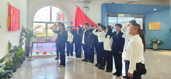 在課程結(jié)束之際,少先隊(duì)員發(fā)出了“勿忘國恥 吾輩自強(qiáng)”的錚錚誓言;黑龍江外國語學(xué)院藝術(shù)系輔導(dǎo)員張博雅帶領(lǐng)在場全體黨員重溫了入黨誓詞。短短的十二句話,道出了中國共產(chǎn)黨的百年奮斗歷程,凝聚著每一名黨員不忘初心、堅(jiān)守理想的信念與力量。面對(duì)黨旗,全體黨員莊嚴(yán)地舉起右拳宣誓,表達(dá)了矢志不渝跟黨走的決心和勇?lián)姑⒉回?fù)黨恩的堅(jiān)定信念。