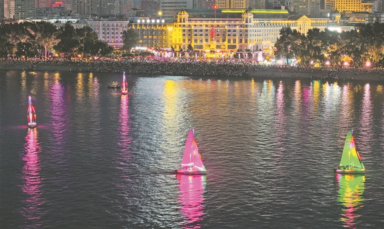 近日,松花江哈爾濱市道里區(qū)防洪勝利紀念塔江段,每晚都會有多艘靚麗的彩色帆船巡游表演。十幾艘白色帆船船身上變幻的4D彩飾燈,仿佛披著斑斕的霓裳,光影暈染在波光粼粼的江面,形成一道道淺淺的虹,讓夏夜的松花江愈顯美麗動人。這是哈爾濱市總工會組織的職工帆船表演隊,每艘帆船上安裝有百米長燈帶、小型發(fā)電機和微電腦,形成4D燈光秀效果,每天9時30分至11時、19時30分至21時表演。