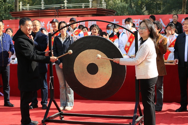 隨后黑龍江省希望工程捐助中心杜晶主任和哈師大附中校長(zhǎng)劉振成一同鳴響大鑼,鑼聲響徹整個(gè)凱德廣場(chǎng),劉校長(zhǎng)宣布義賣(mài)會(huì)正式開(kāi)始。