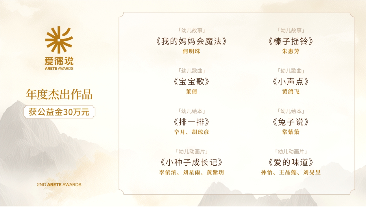 揭曉盛典上,幼兒故事《我的媽媽會魔法》《榛子搖鈴》,幼兒歌曲《寶寶歌》《小聲點(diǎn)》,幼兒繪本《排一排》《兔子說》及幼兒動(dòng)畫片《小種子成長記》《愛的味道》8部作品獲評第二屆“愛德說”幼兒德育作品征集活動(dòng)“年度杰出作品”,每部作品獲得主辦方提供的公益金人民幣30萬元。