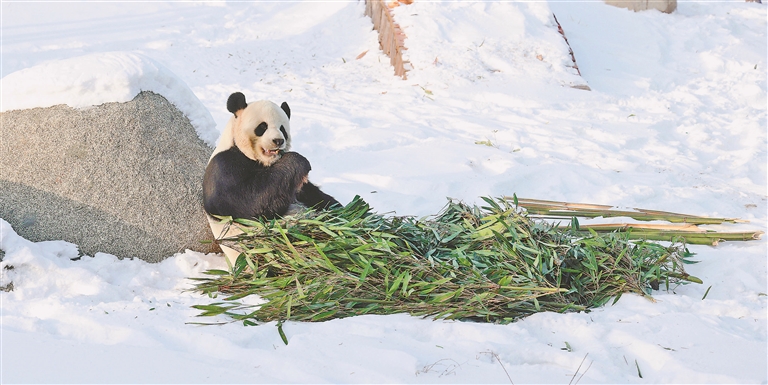 尤其是“佑佑”,曬著午后暖陽,坐在室外的雪地里,大口“狂炫”竹葉,這一口吃夠了,就尋覓著從雪里刨出來一根竹筍,秒變“剝筍小哥”?!坝佑印边€時(shí)不時(shí)停下來,盯著人群定格幾秒,仿佛是專門為游客拍照擺好姿勢(shì),令不少南方小伙伴感嘆“開了眼界”。