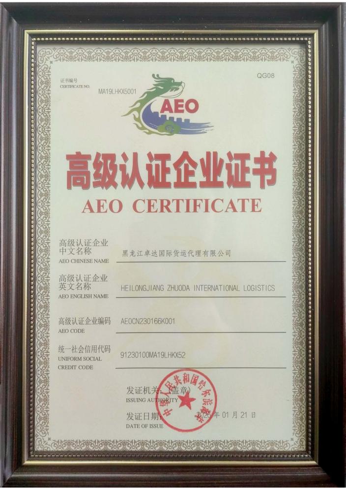 圖1黑龍江卓達(dá)國際貨運(yùn)代理有限公司AEO認(rèn)證證書