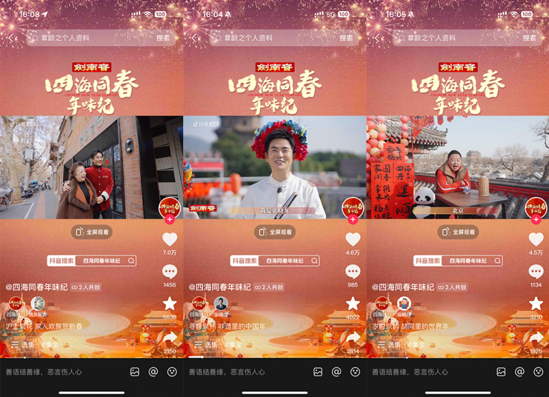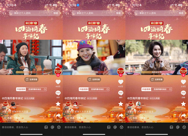 為紀(jì)念首個(gè)“非遺版春節(jié)”,由抖音出品、中國名酒劍南春冠名的春節(jié)主題紀(jì)錄片《四海同春年味紀(jì)》邀請多位明星來到家鄉(xiāng)或向往的城市,體驗(yàn)當(dāng)?shù)靥厣晡?。紀(jì)錄片于1月22日-1月27日,通過抖音、抖音精選、今日頭條、西瓜視頻、鮮時(shí)光等平臺播出。截至收官,該片正片播放量超1億,抖音話題播放量破2.3億,全網(wǎng)曝光達(dá)10億,相關(guān)話題多次登上平臺熱榜。