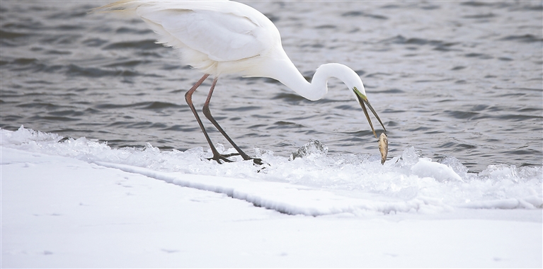 冰排流動(dòng),數(shù)百只鷺鳥羽翅翻飛,鳴聲陣陣,此時(shí)的松花江一派生機(jī)勃勃的景象。