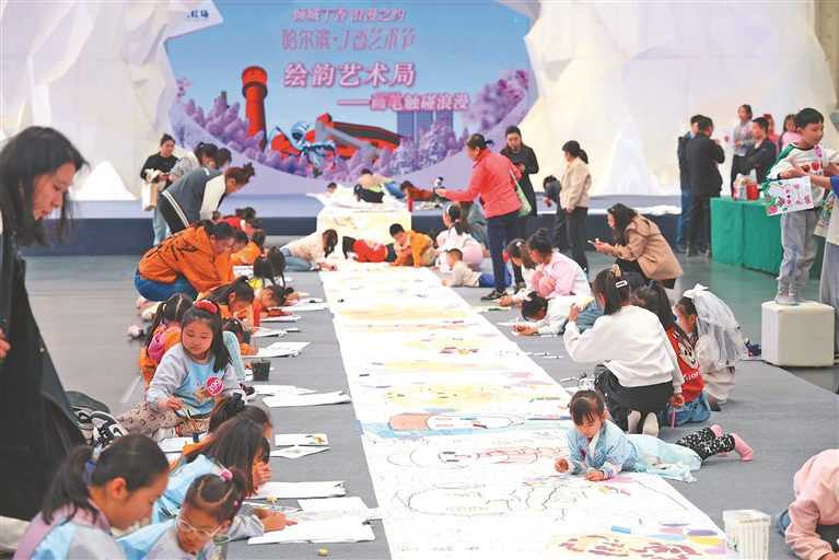 1日,“傾城丁香·浪漫之約”2025哈爾濱丁香藝術周在西城紅場美術館啟幕。圖為少兒丁香主題繪畫活動。