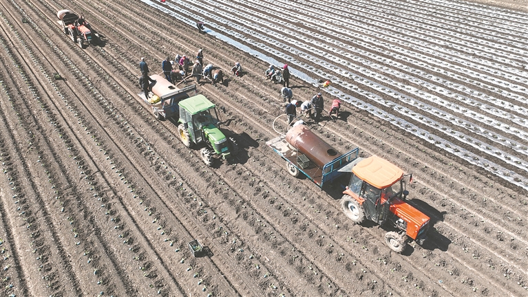 通往新華鄉(xiāng)的道路兩側(cè),儼然一幅動態(tài)的農(nóng)事畫卷:拖拉機“突突”作響,拉著水罐在田壟間穿梭;菜農(nóng)們分工默契,有人鋪設(shè)地膜,白色薄膜在黑土地上延展成浪;有人彎腰移栽,鮮嫩菜苗被小心植入土中;有人手持水管緊隨其后,清水汩汩滋潤著新苗。覆膜、栽苗、澆水,動作連貫流暢,田埂間回蕩著農(nóng)具與泥土的碰撞聲,交織成初夏最生動的勞作交響。