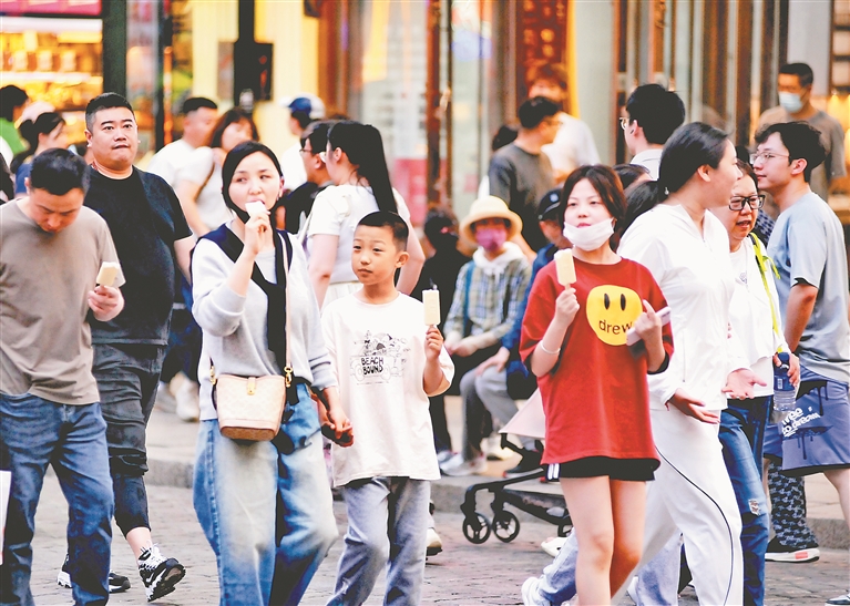 5月30日晚,端午前夜,市民、游客從四面八方匯聚到哈爾濱市中央大街,奔向松花江畔踏青、游玩。
