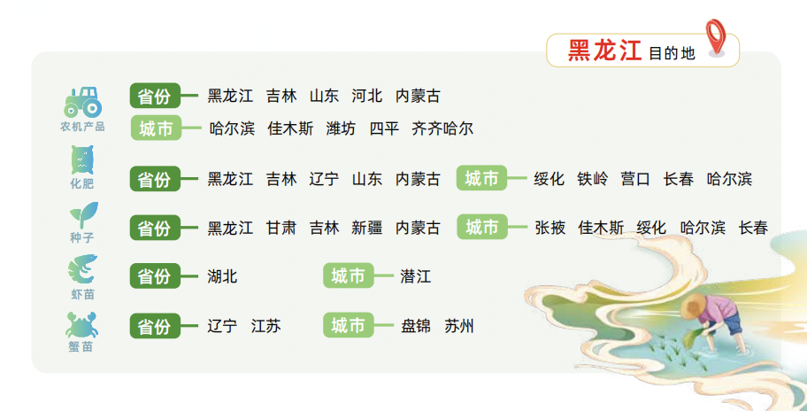 化肥和種子是春耕不可或缺的“糧食”。運(yùn)滿(mǎn)滿(mǎn)大數(shù)據(jù)顯示,運(yùn)往黑龍江的化肥產(chǎn)品主要來(lái)自東北三省以及山東、內(nèi)蒙古等地,黑龍江綏化、哈爾濱等地區(qū)在省內(nèi)化肥調(diào)配中發(fā)揮了重要作用,省外的鐵嶺、營(yíng)口、長(zhǎng)春等地也積極輸送化肥。種子產(chǎn)品則來(lái)自黑龍江本地以及甘肅、吉林、新疆、內(nèi)蒙古等地,佳木斯、綏化、哈爾濱等地成為省內(nèi)種子供應(yīng)的樞紐,省外的張掖、長(zhǎng)春等地也為黑龍江春耕貢獻(xiàn)力量。