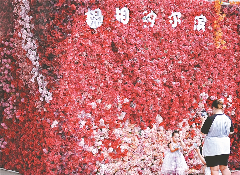 近日,哈爾濱市建筑藝術(shù)廣場上,游客們在新景觀前打卡拍照。這些景觀有彩繪墻壁,有花卉構(gòu)成的圖案,還有裝扮一新的商亭。它們構(gòu)思新穎,造型獨特,成為廣場上的新亮點。