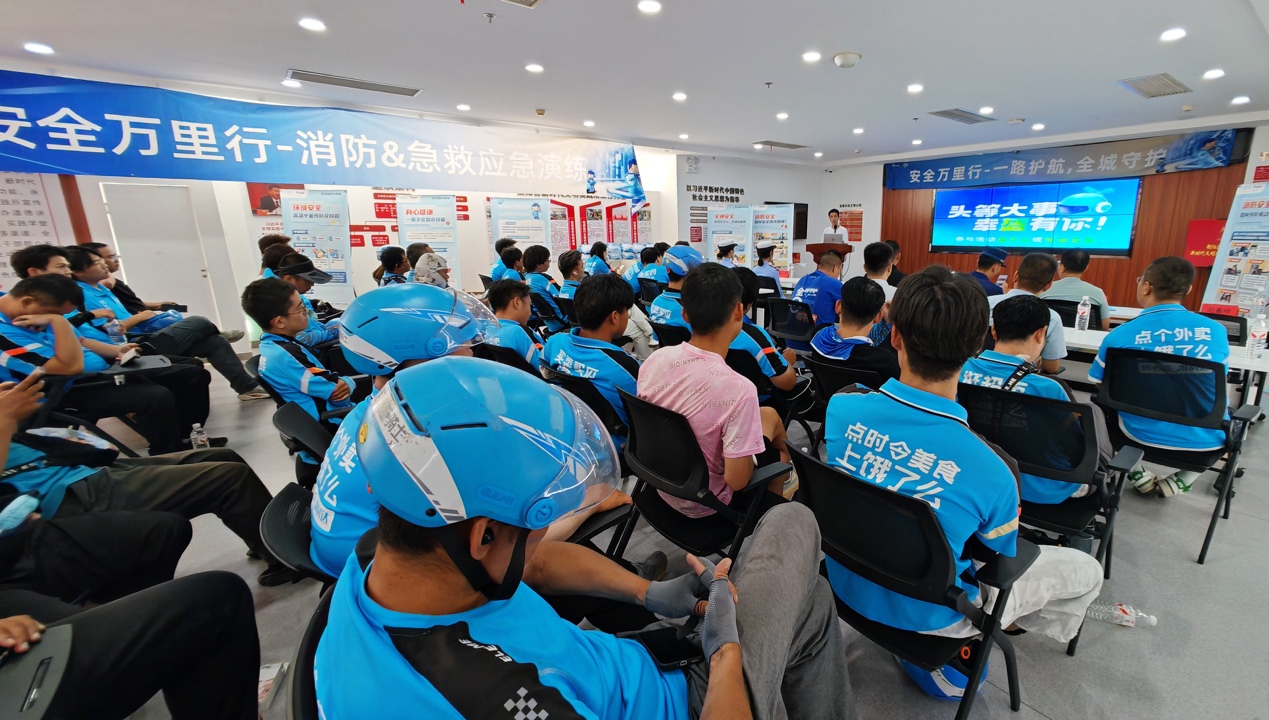騎手既是安全出行的參與者,也是城市生活的守護(hù)者。當(dāng)天,北京市公安局公安交通管理局朝陽交通支隊(duì)、北京市朝陽區(qū)消防救援支隊(duì)舉行了安全知識(shí)講座,餓了么還為騎手進(jìn)行了應(yīng)急救援培訓(xùn)。