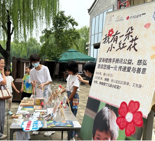 北京慈弘慈善基金會(huì)在后海望海樓舉辦“小紅花公益市集”,通過(guò)義賣(mài)來(lái)支持鄉(xiāng)村學(xué)校圖書(shū)角建設(shè),受到市民和游客們的歡迎