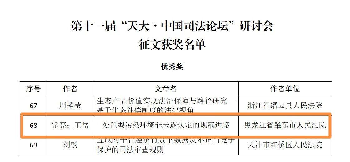 黑龍江經(jīng)濟(jì)網(wǎng)訊(董慧瑩 李雪松)近日,由中國(guó)行為法學(xué)會(huì)司法專業(yè)委員會(huì)主辦、天津大學(xué)承辦的第十一屆“天大·中國(guó)司法論壇”研討會(huì)征文獲獎(jiǎng)名單公布。本次征文活動(dòng)共收到投稿論文620篇,經(jīng)評(píng)委會(huì)嚴(yán)格評(píng)審,共選出一等獎(jiǎng)8個(gè)、二等獎(jiǎng)24個(gè)、三等獎(jiǎng)48個(gè)、優(yōu)秀獎(jiǎng)102個(gè)。其中,肇東市人民法院審管辦副主任常亮、審管辦書(shū)記員王岳撰寫的學(xué)術(shù)論文《處置型污染環(huán)境罪未遂認(rèn)定的規(guī)范進(jìn)路》榮獲優(yōu)秀獎(jiǎng)。