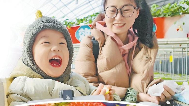 冰天雪地中,推開溫室大棚的門,好像換了一個季節(jié),孩子們采摘的歡樂彌漫開來。