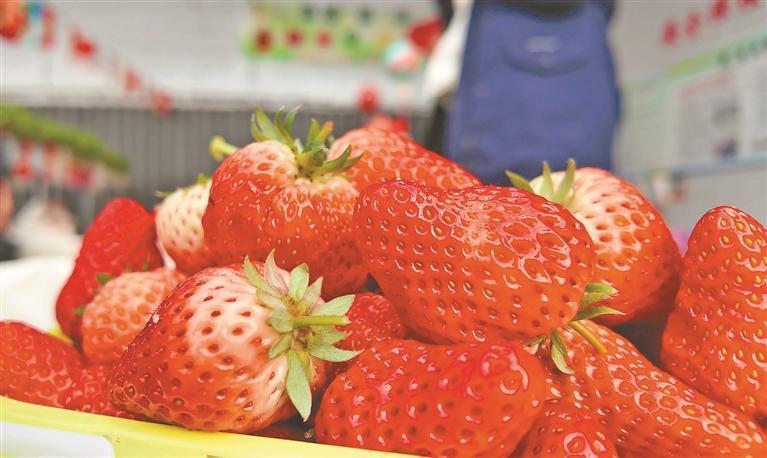 “這還有個大的,可紅啦。”翠綠的草莓架下,小朋友拎著籃子來回穿梭,游客一邊采摘一邊品嘗。這里的草莓潔凈鮮亮,摘下來不用洗就能直接吃,咬一口,清甜的草莓汁溢滿唇齒。